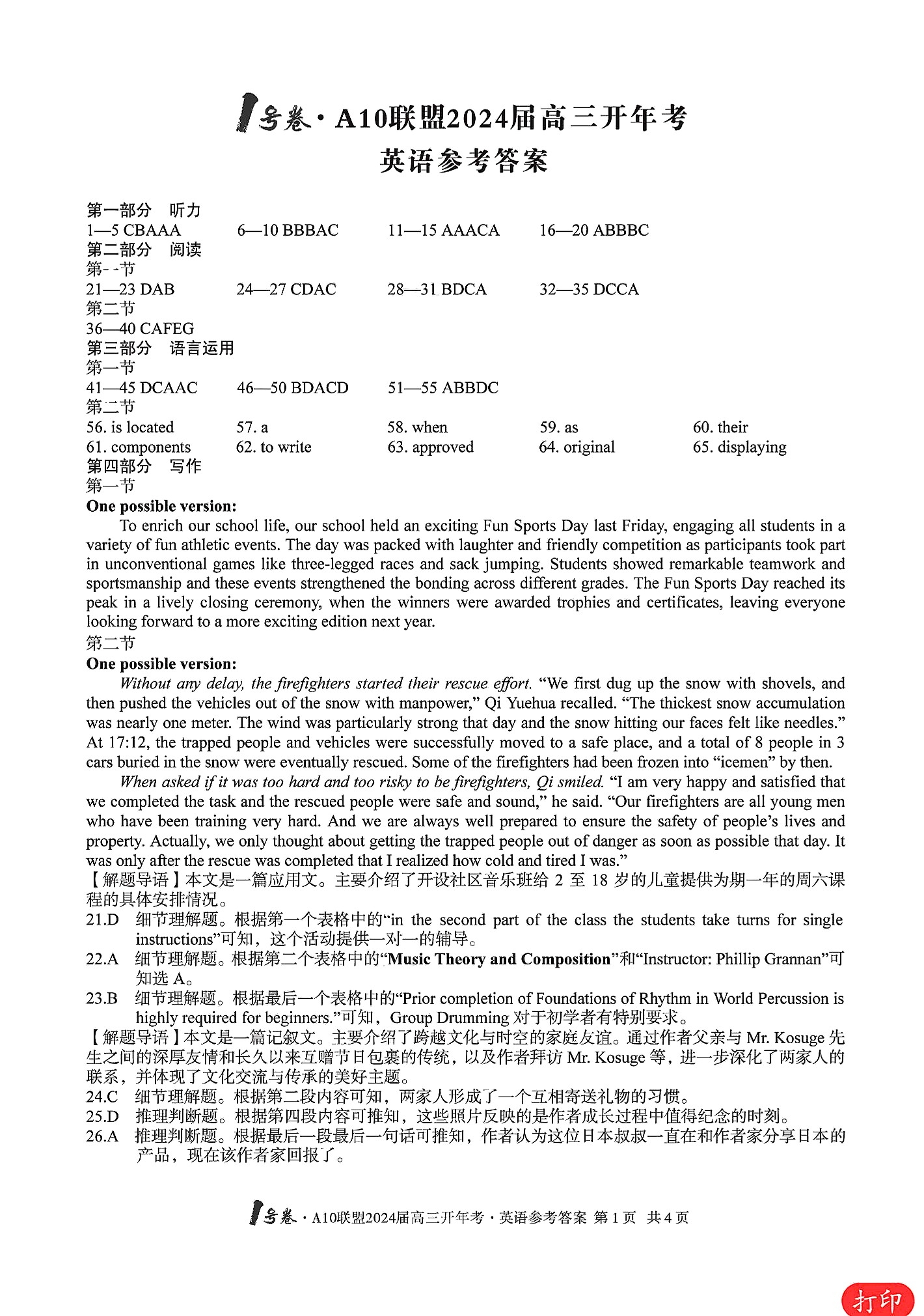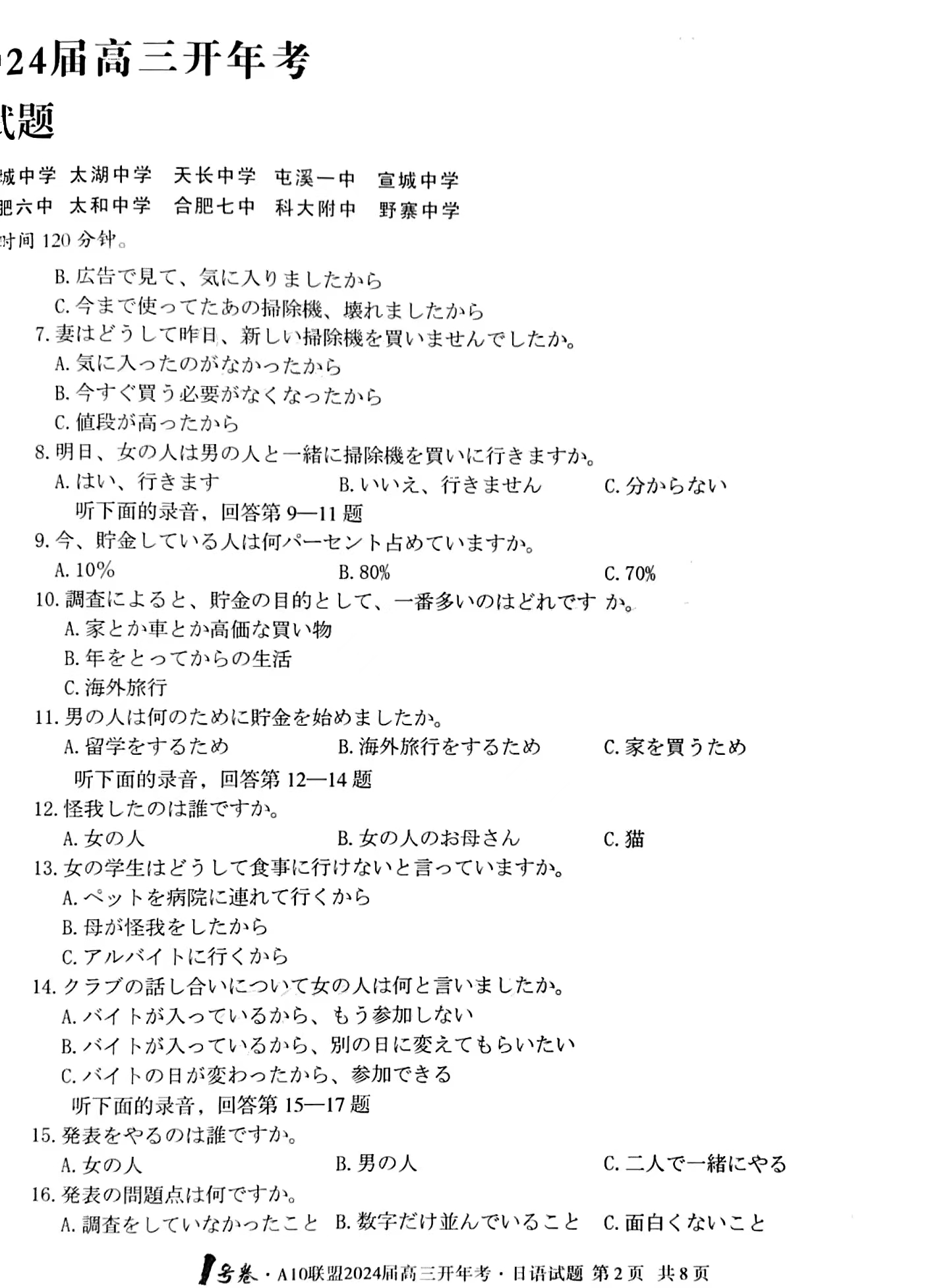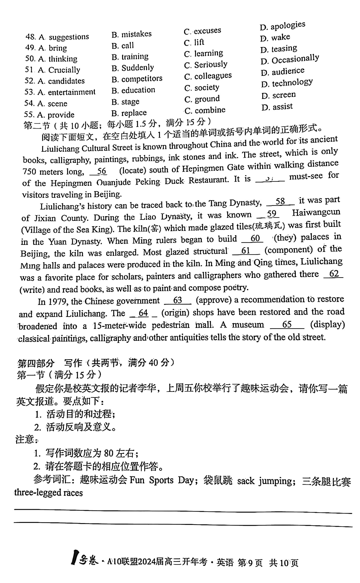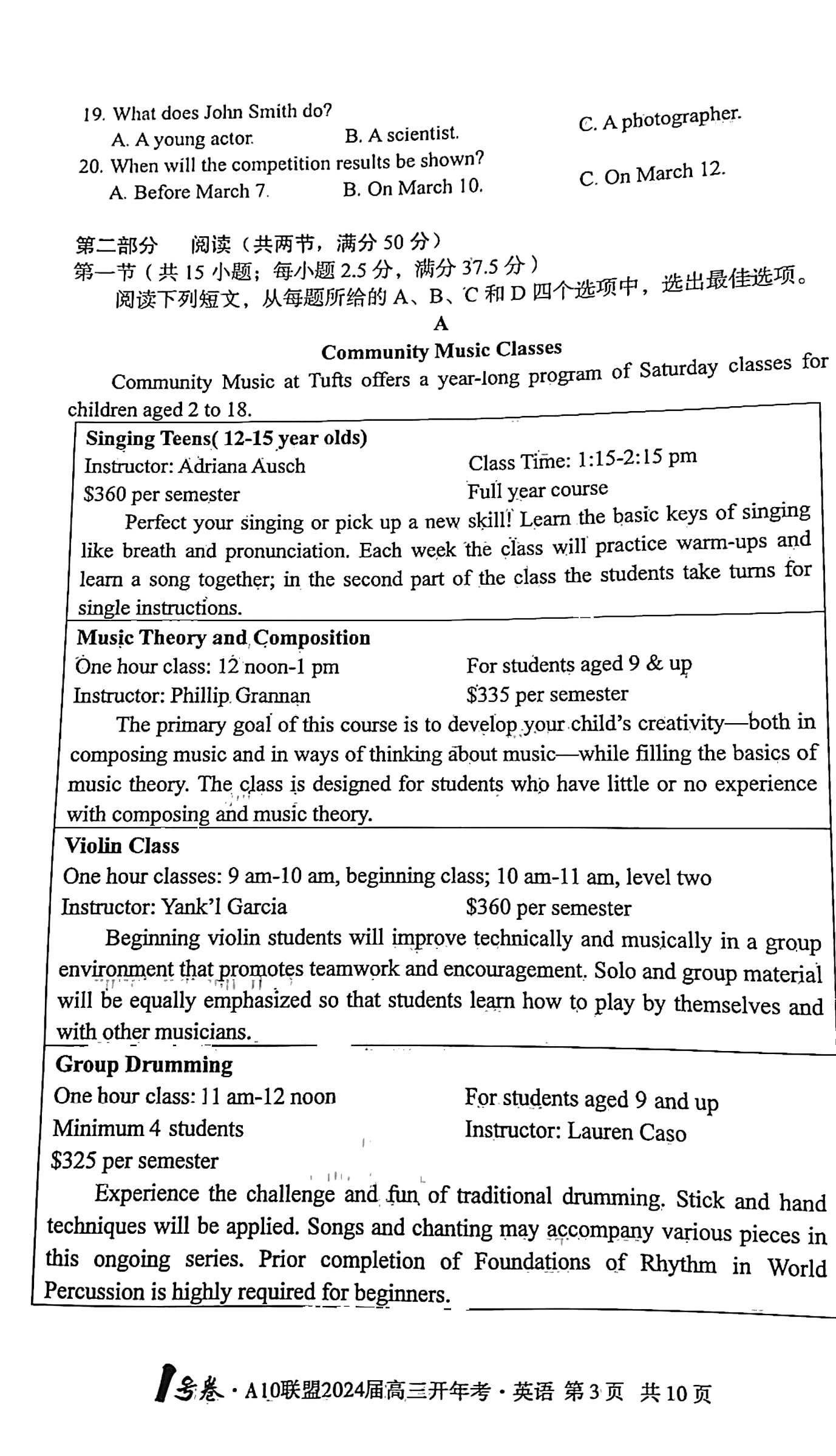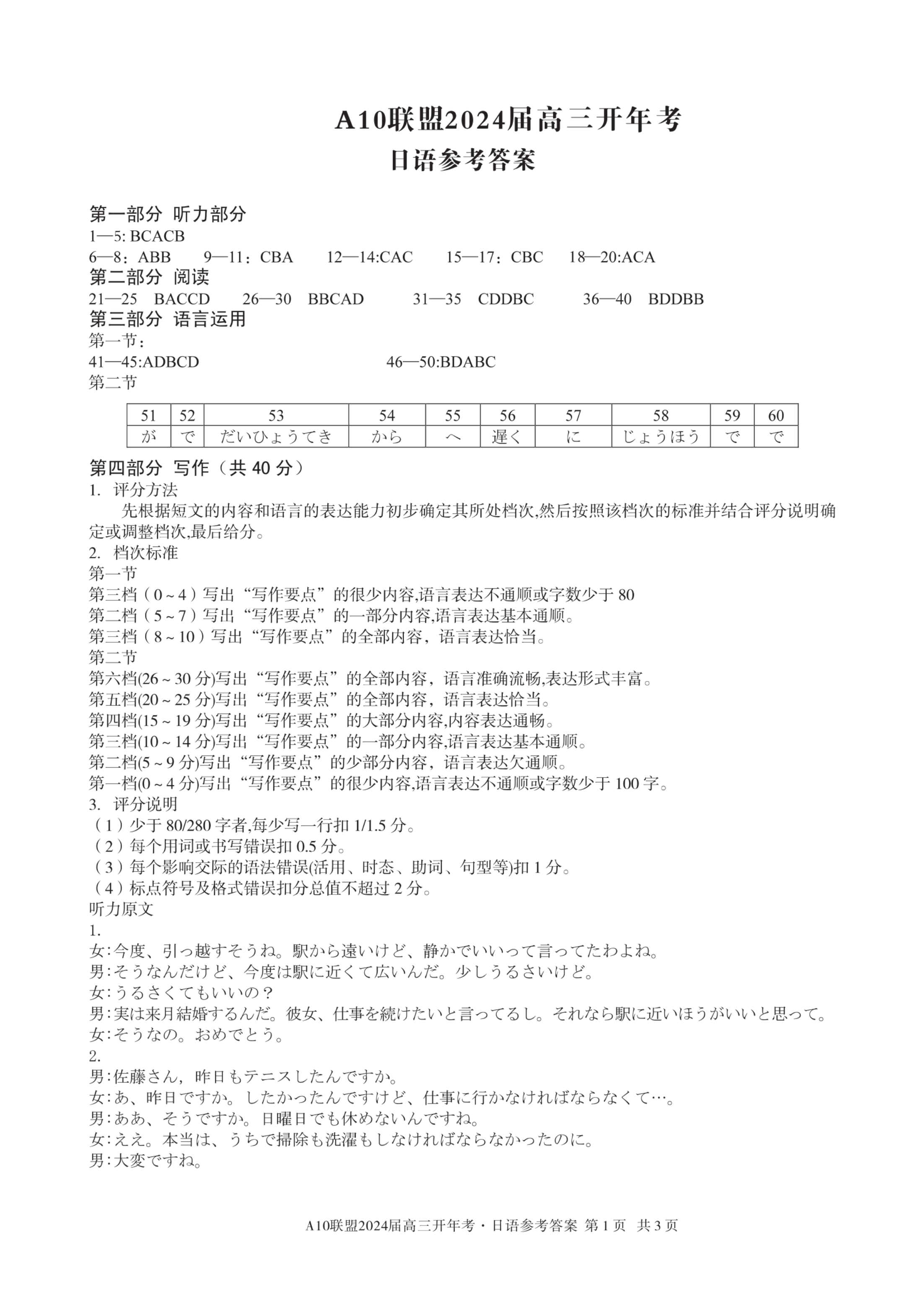 3.2024安徽a10联盟高三开年考外语试卷及答案