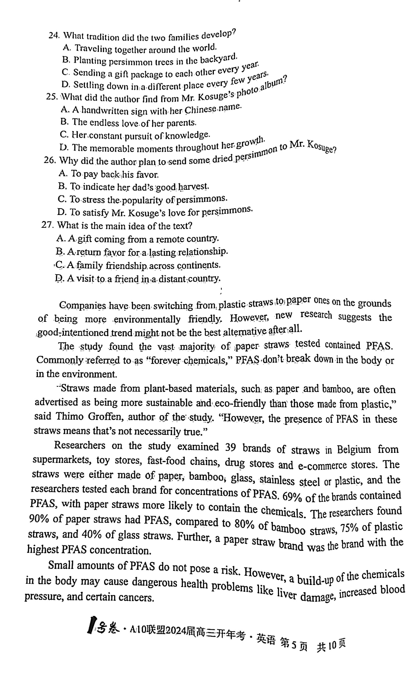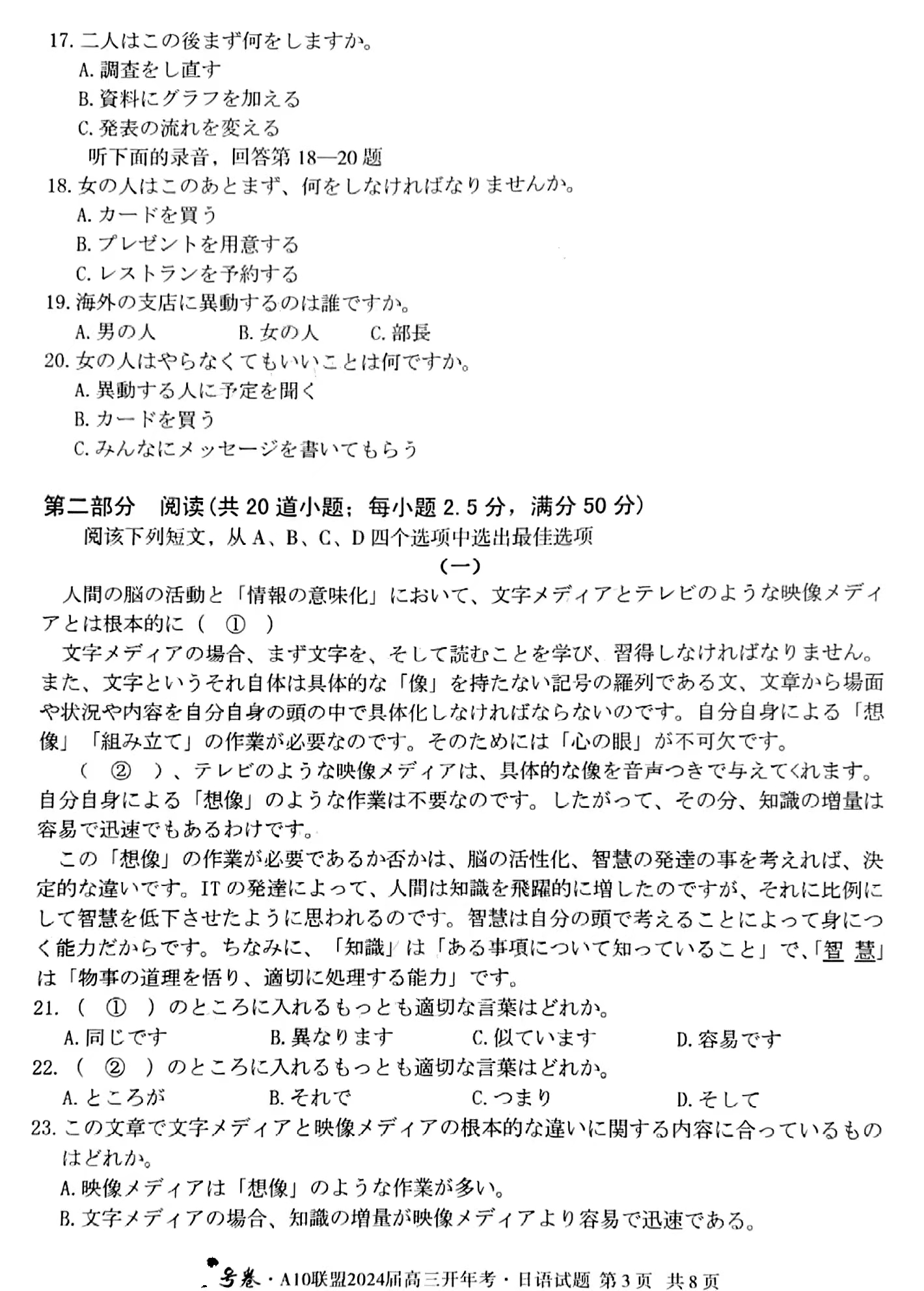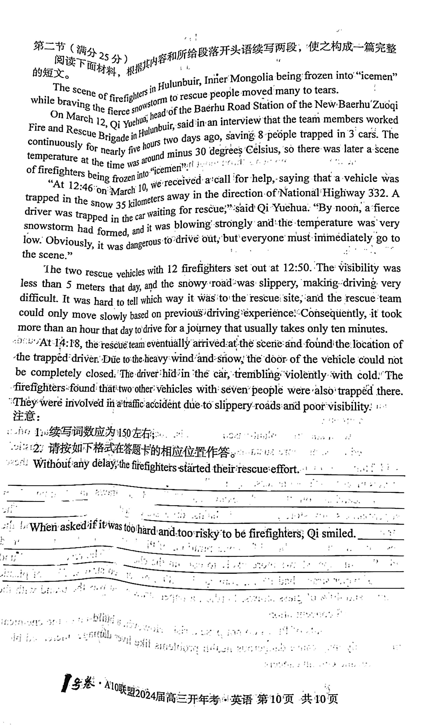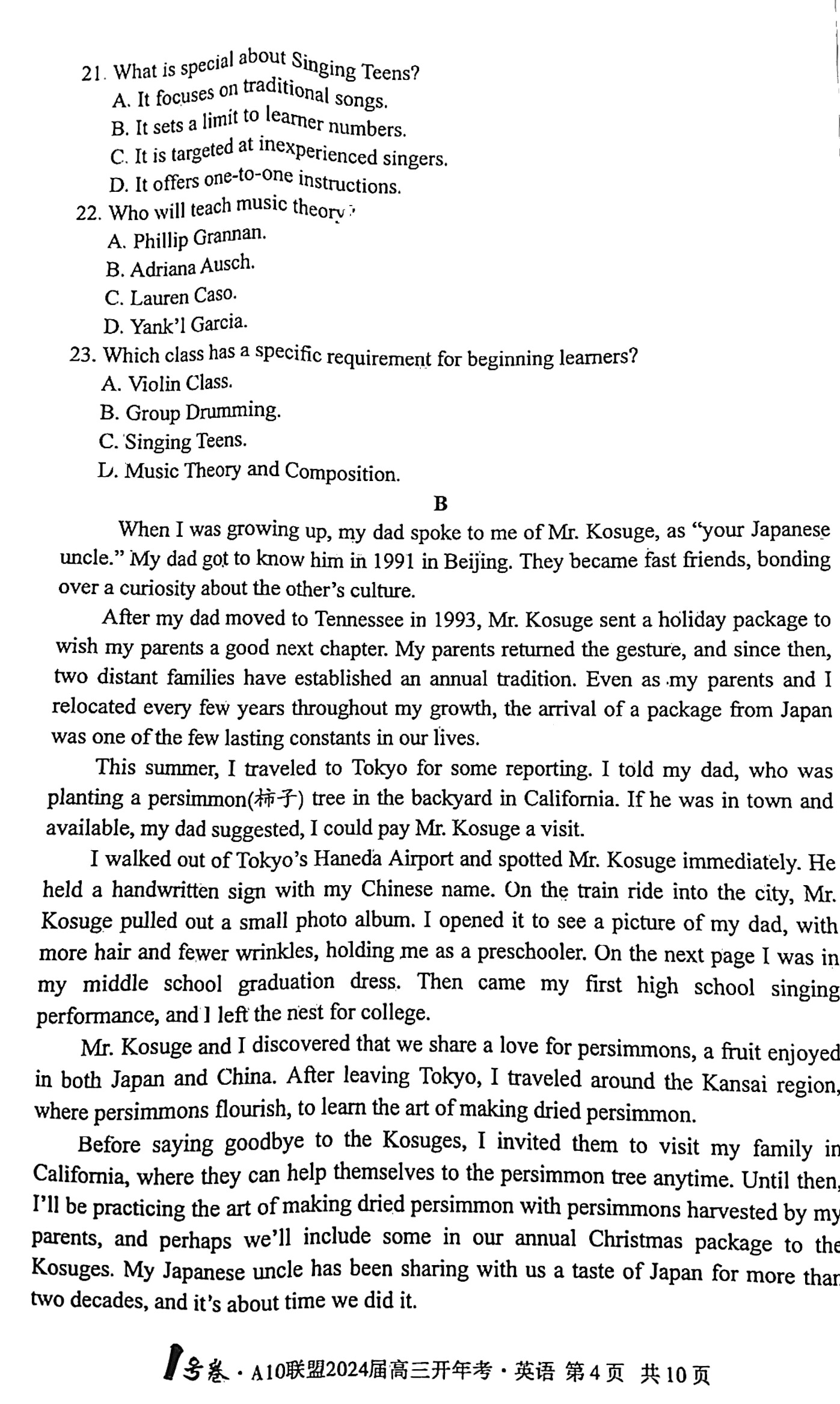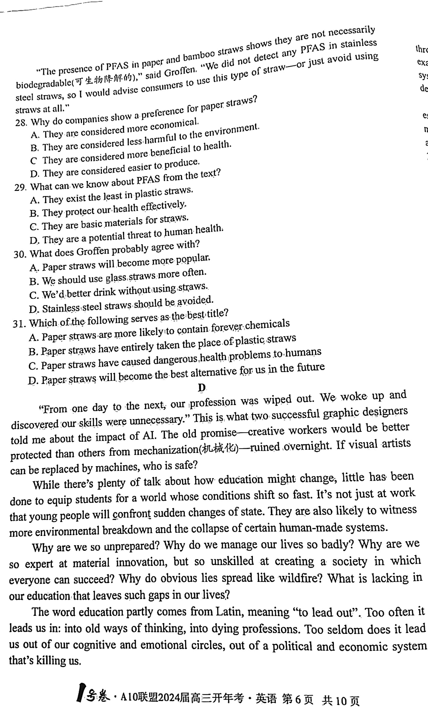 3.2024安徽a10联盟高三开年考外语试卷及答案