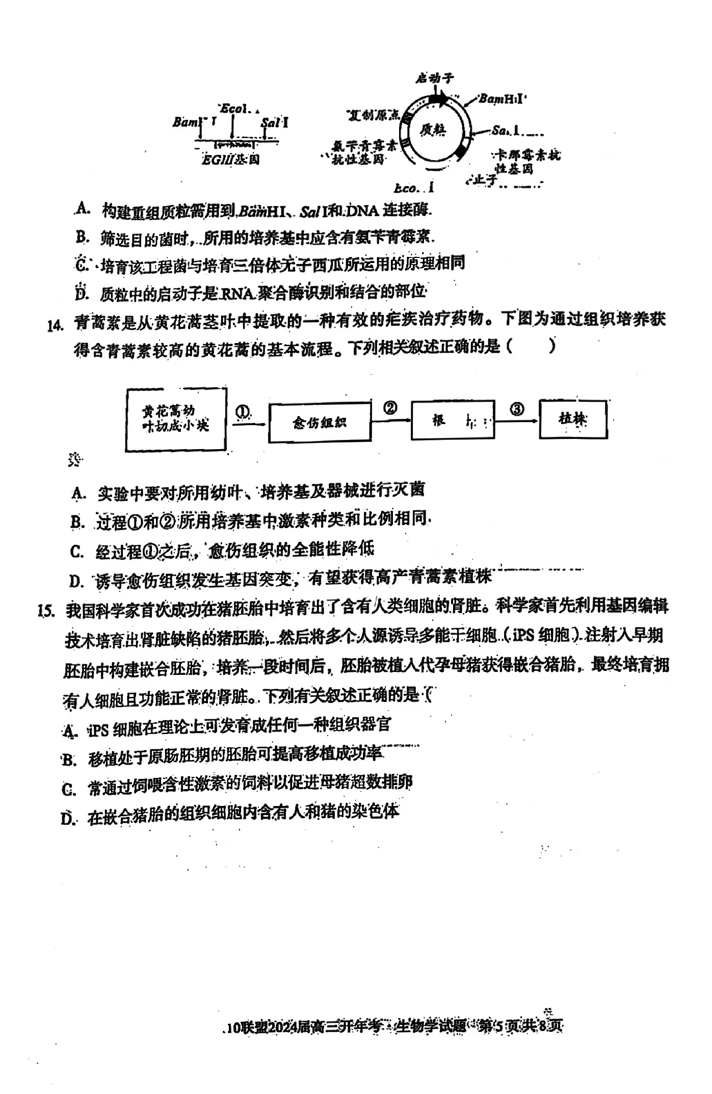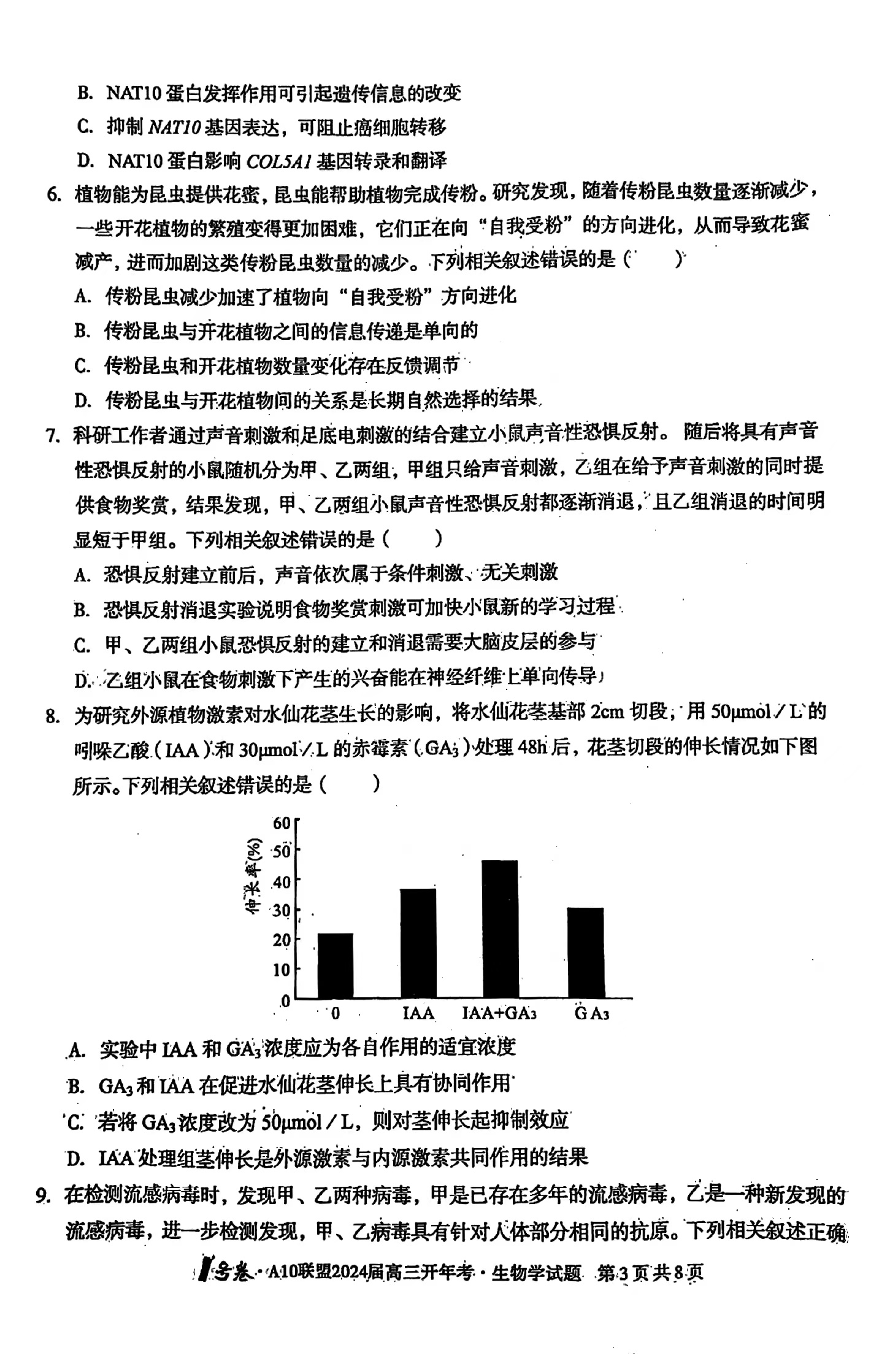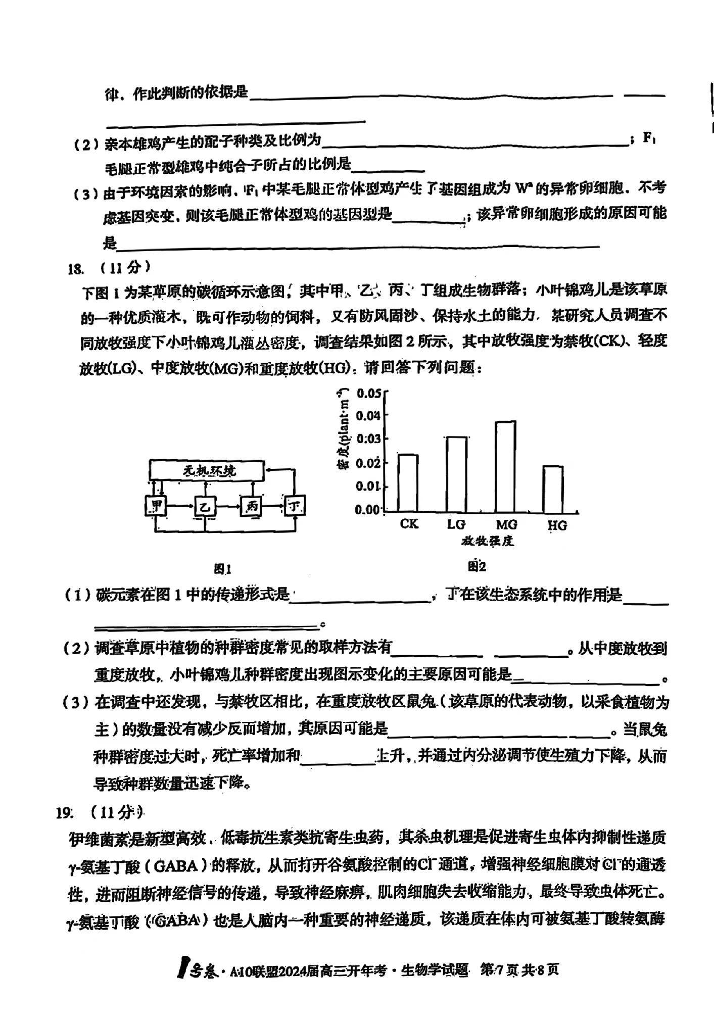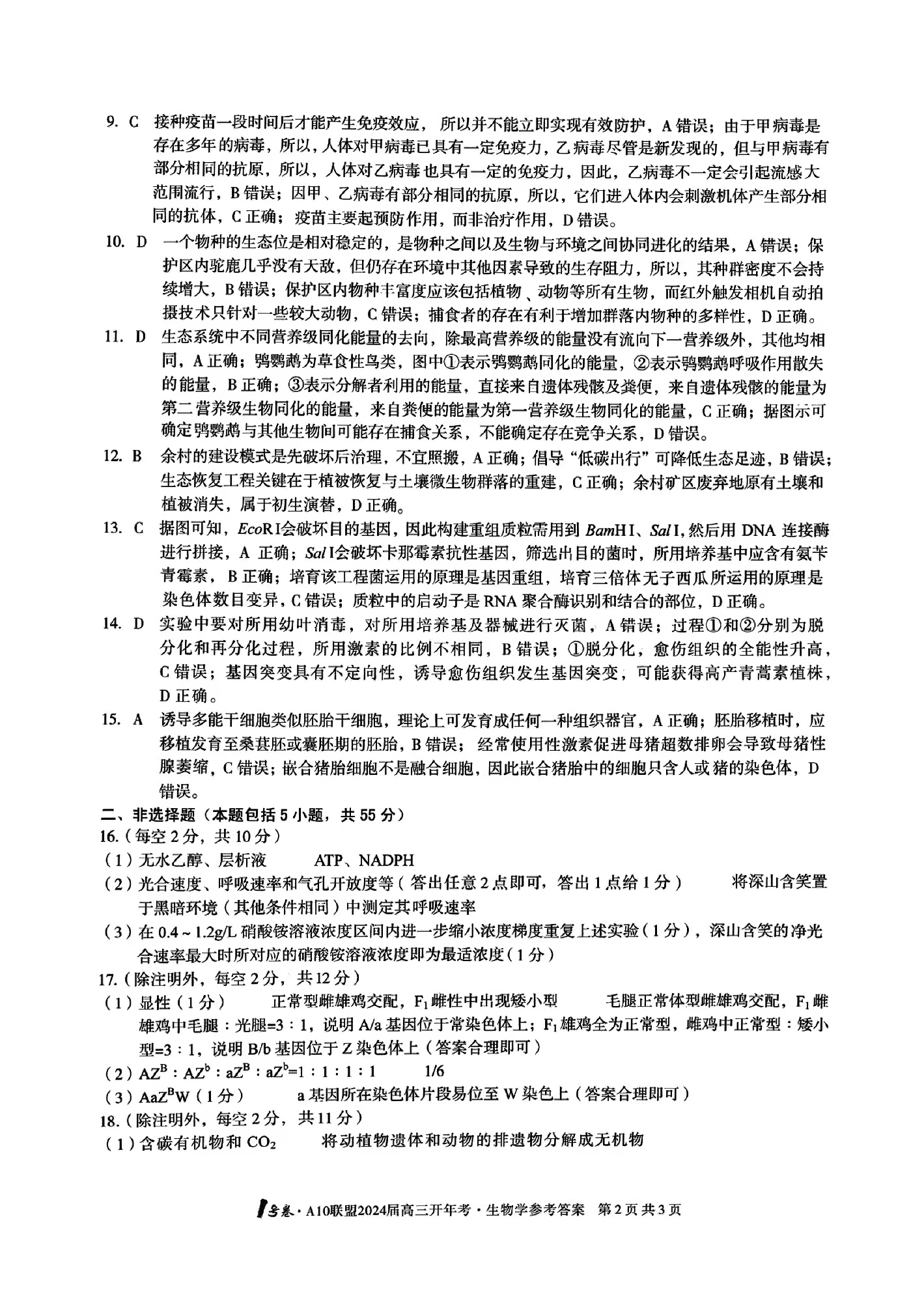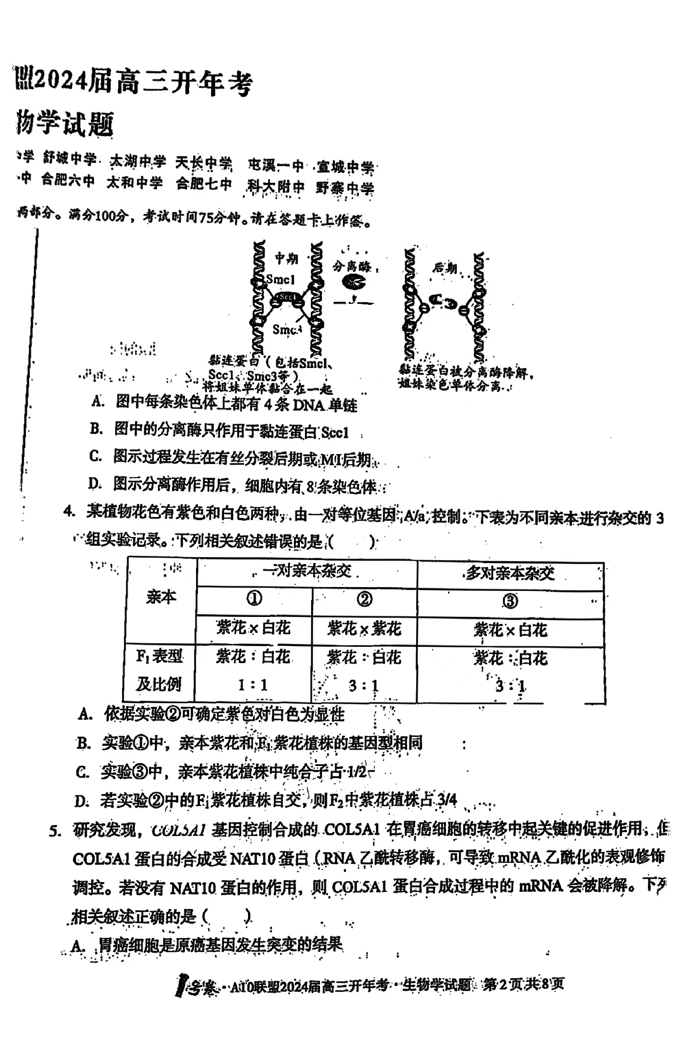 7.2024安徽a10联盟高三开年考生物试卷及答案