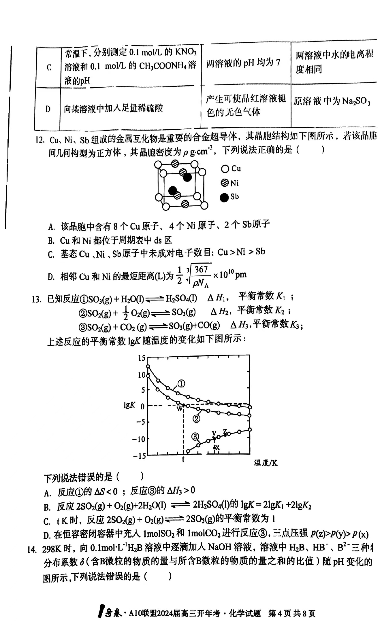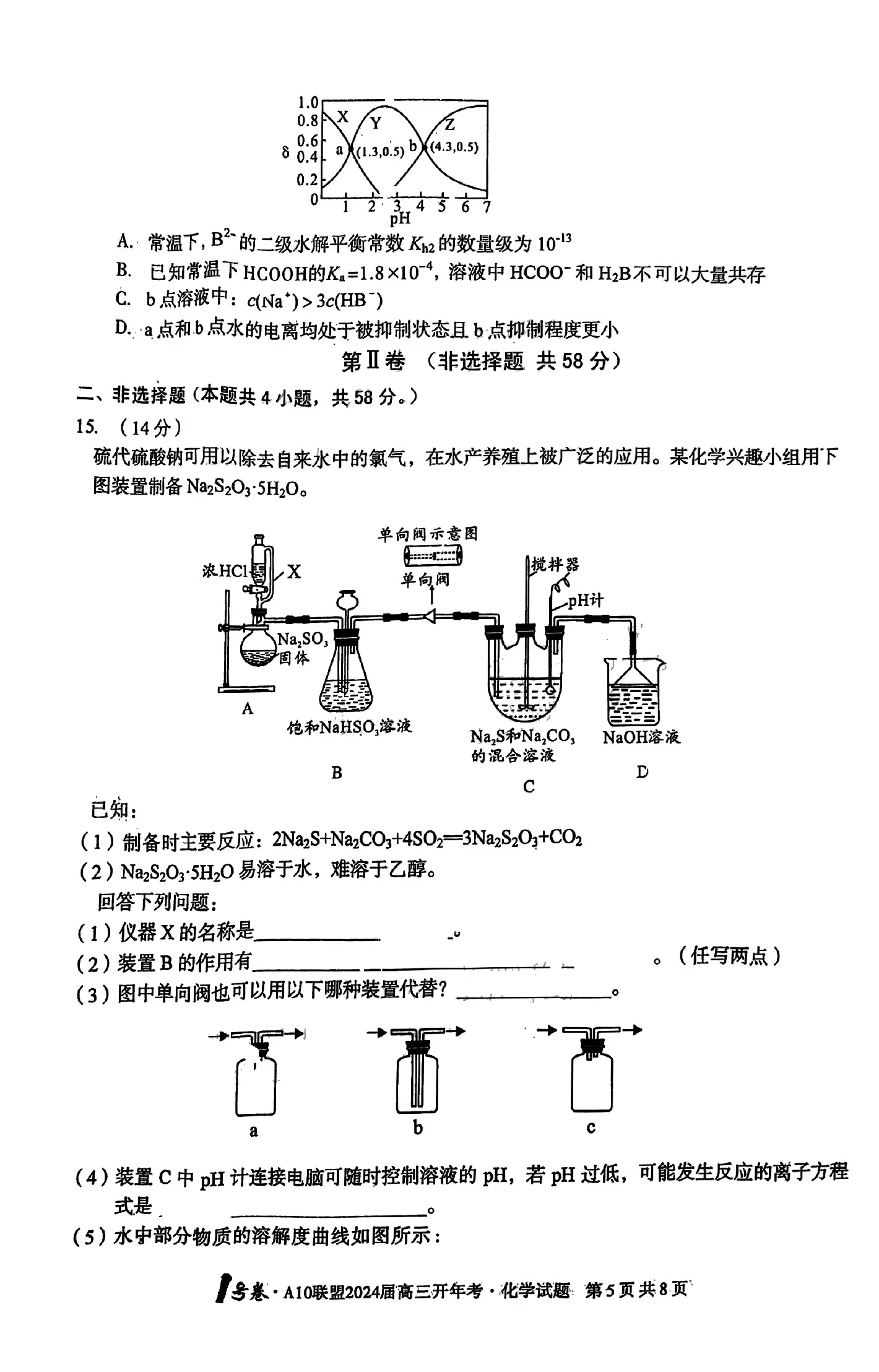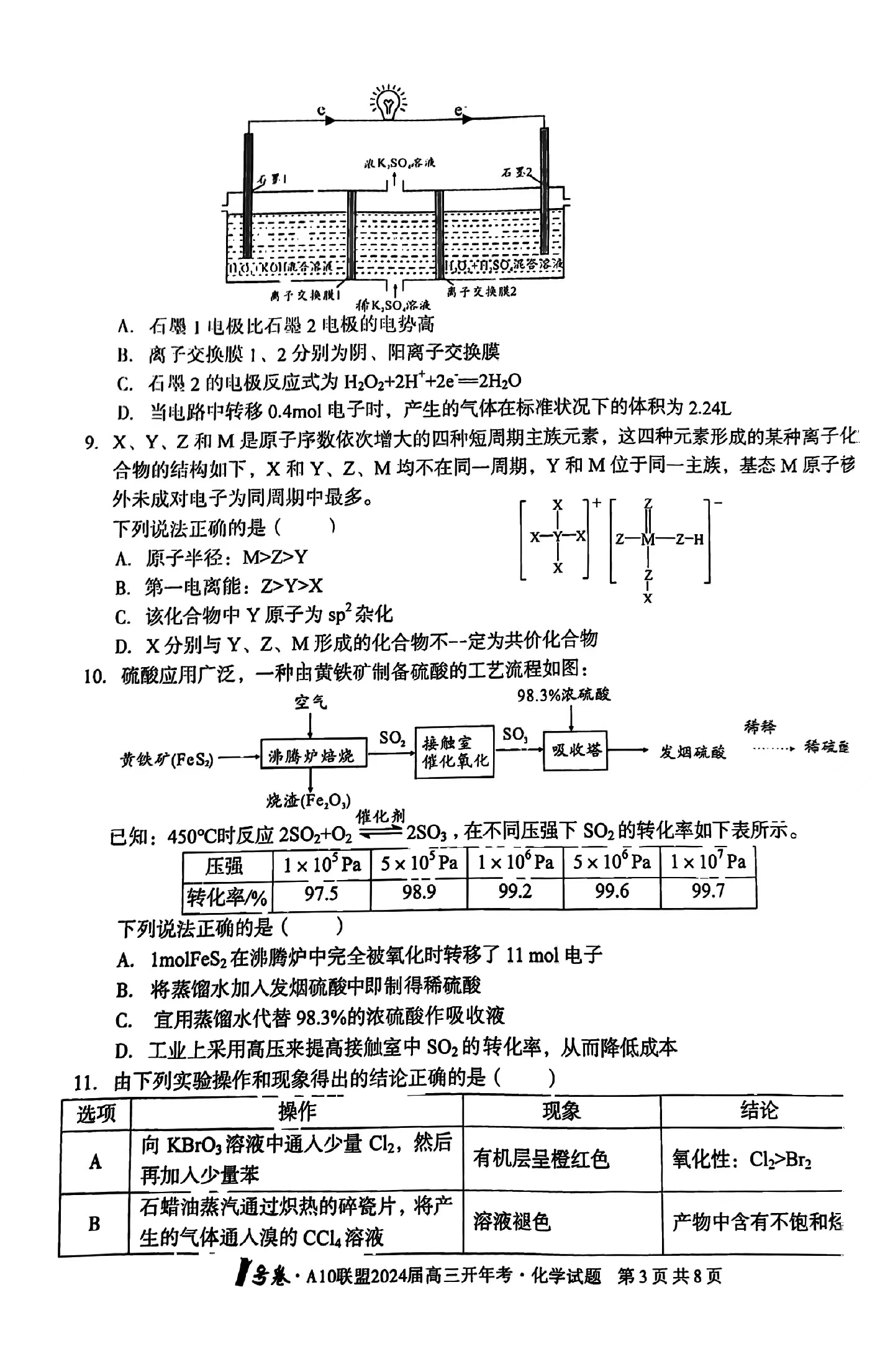 6.2024安徽a10联盟高三开年考化学试卷及答案