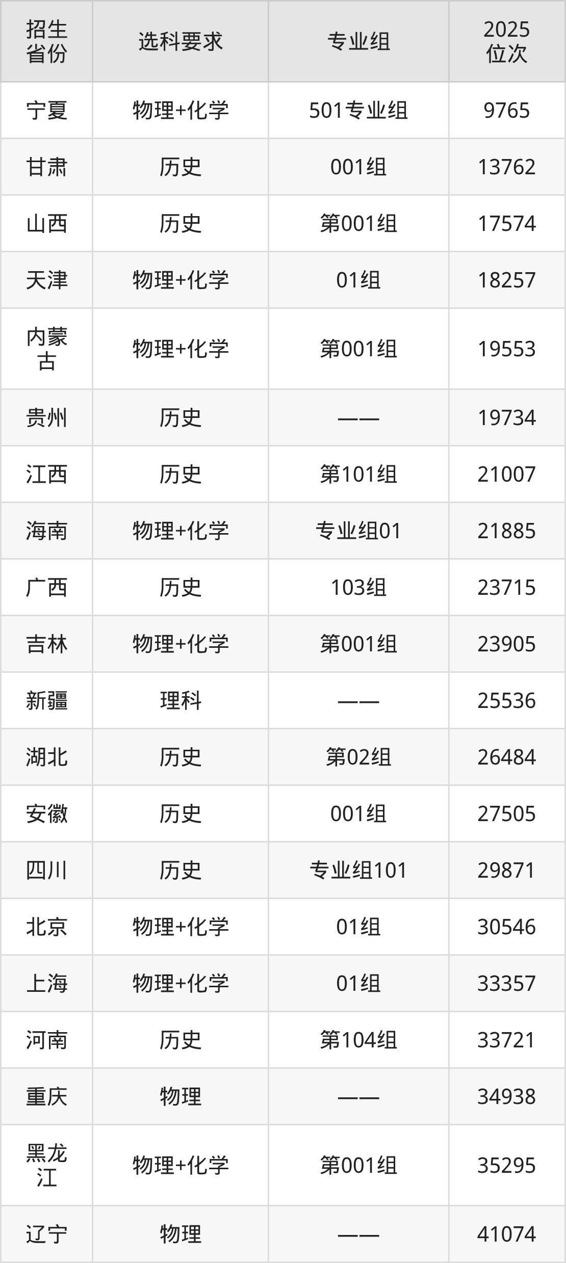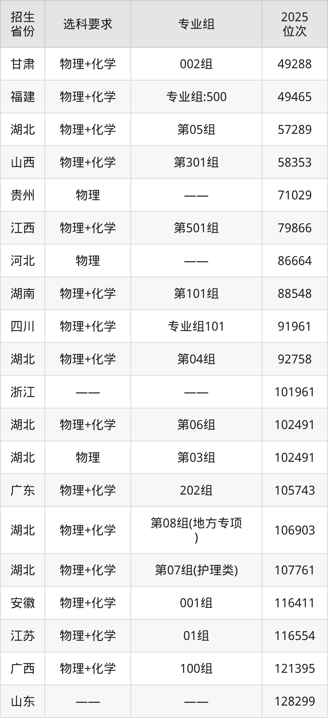 湖北医药学院2025年在全国各省的位次差异较大,最高位次是9765位(宁夏物理类)、最低位次是129826位(河南物理类)。各省具体位次请看下图: