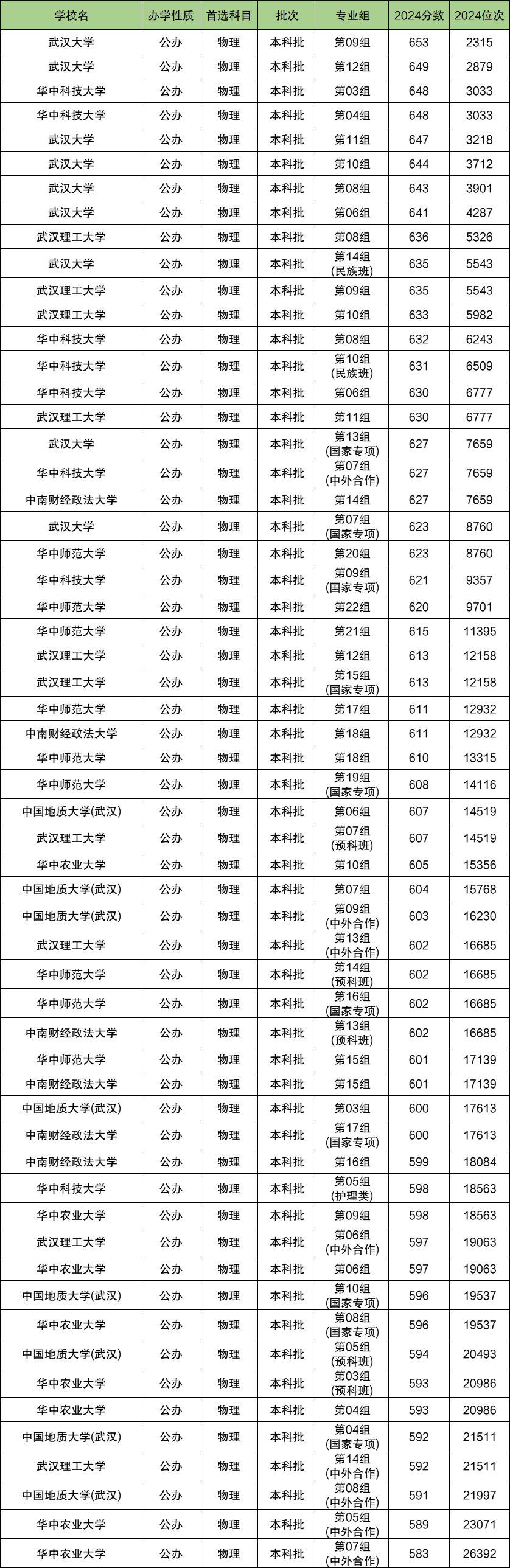 下文为2024年湖北省211大学在湖北物理类录取分数线和位次排名表,供大家参考: