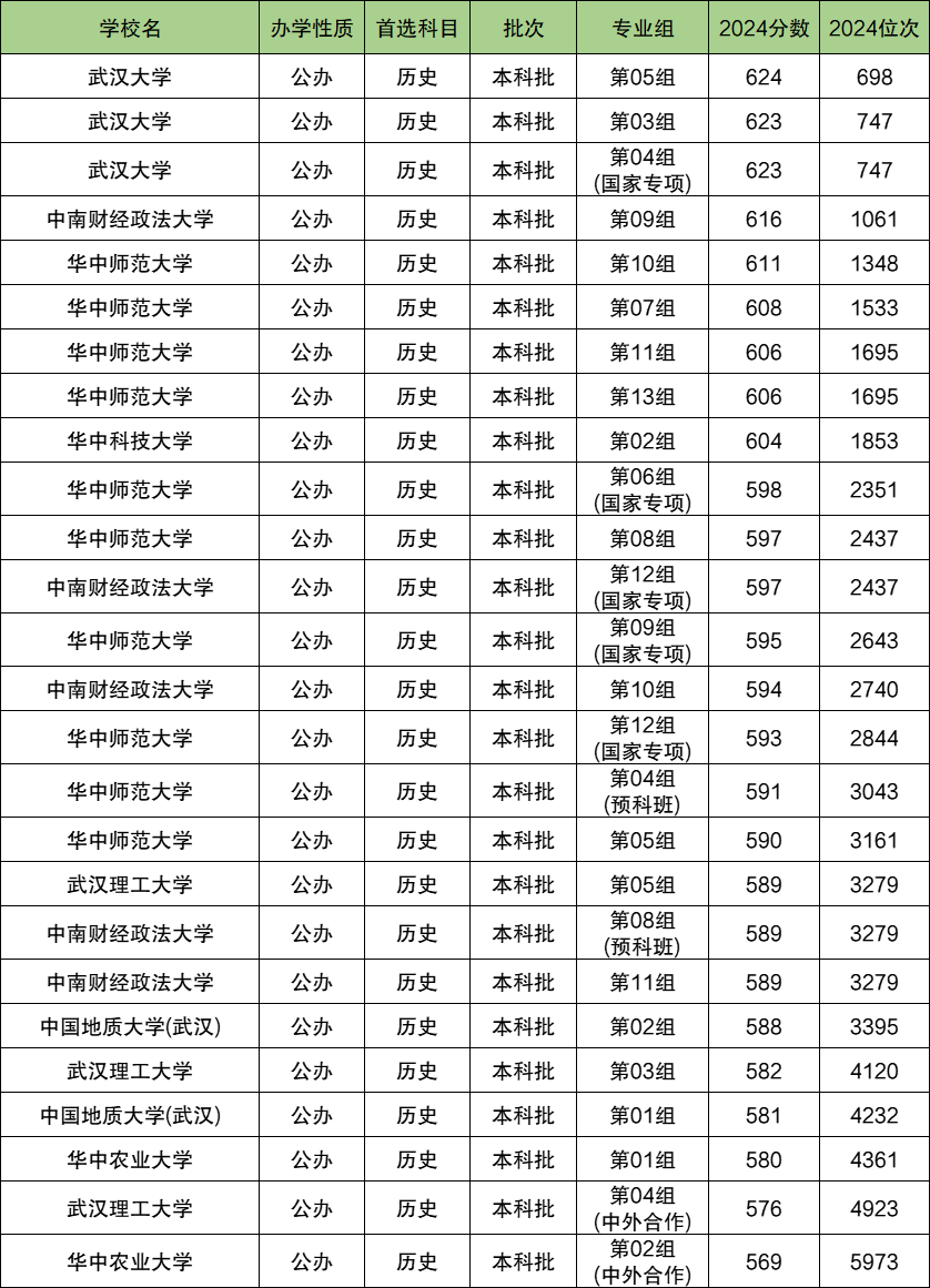 下文为2024年湖北省211大学在湖北历史类录取分数线和位次排名表,供大家参考: