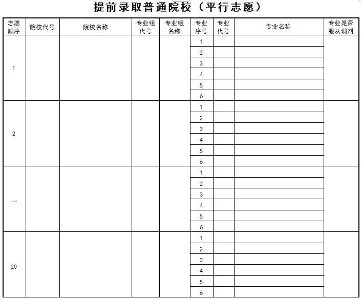④提前录取普通院校(实行平行志愿,设20个院校专业组志愿):公安司法消防院校、香港中文大学、香港城市大学、航海类专业、国家公费师范生、国家优师专项、地方公费师范生、国家免费医学生以及教育部批准的院校专业;