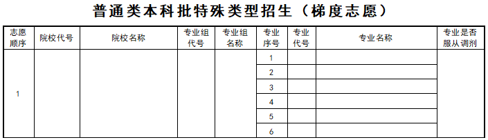 ①特殊类型招生(实行梯度志愿,设1个院校专业组志愿):高水平运动队、高校专项计划等特殊类型招生的院校专业;