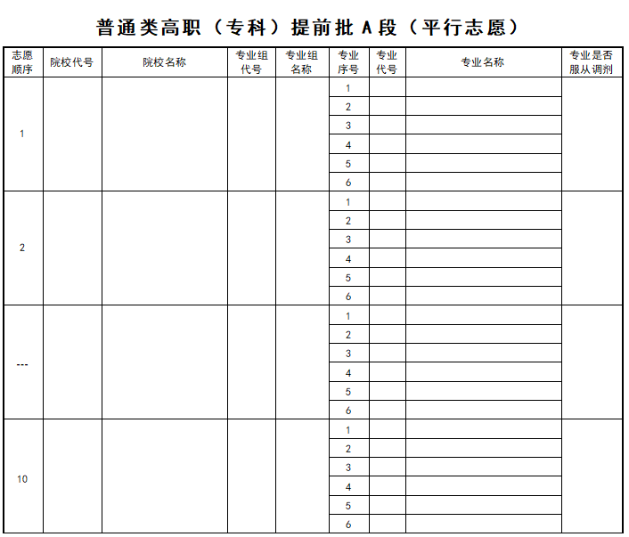 ①普通类高职(专科)提前批A段(实行平行志愿,设10个院校专业组志愿):高本贯通培养、航海类、国家免费医学生和公安司法等招生类型的院校专业;