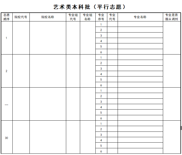 (2)艺术类本科批(实行平行志愿,设30个院校专业组志愿):使用我省艺术类专业课省级统考成绩进行录取的艺术类本科专业;