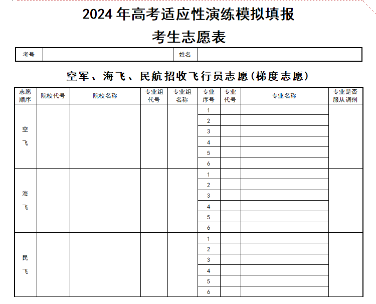 ①招收飞行学员院校(实行梯度志愿,设1个空飞院校专业组志愿、1个海飞院校专业组志愿和1个民飞院校专业组志愿);
