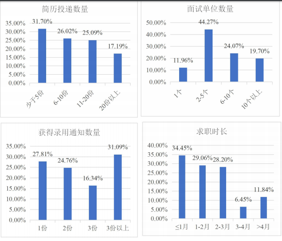 已经落实就业单位的学生中,投递简历少于 10 份获得面试 机会的占比 57.72%,投递简历 10-20 份的占比 25.09%,超过 20 份的占比 17.19%;面 试用人单位少于 5 家获得 offer 的占比 56.23%,面试用人单位 6-10 个的占比 24.07%, 超过 10 家的占比 19.70%;拿到 3 份或以上录用通知的占比 47.43%,拿到 2 份录用通 知的占比 24.76%,拿到 1 份的占比 27.81%;求职时长少于 2 个月的占比 63.51%,求 职时长 2-4 个月的占比 34.65%。