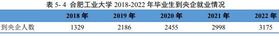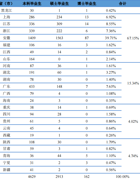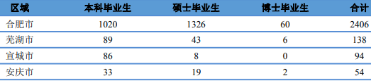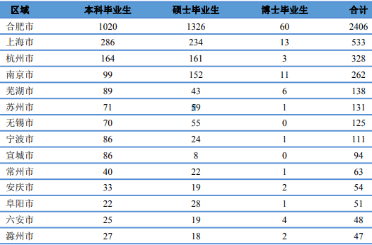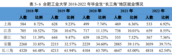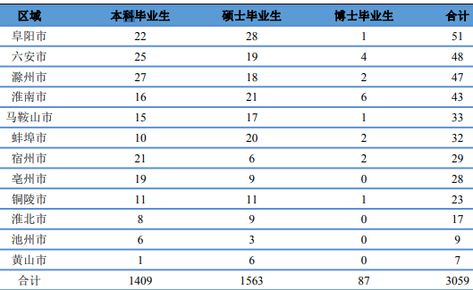 2022 年,毕业生在安徽省就业 3059 人,占比 39.71%。安徽省就业人数前五的地 市分别为合肥市(2406 人)、芜湖市(138 人)、宣城市(94 人)、安庆市(54 人)、 阜阳市(51 人)。