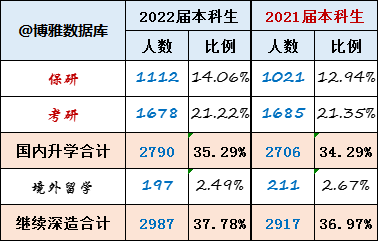 注:2021届保研1021人,是指推免公示名单1021人,根据学校2021学年本科教学质量报告,2021届实际保研994人;深造2917人中二学位5人。