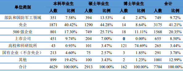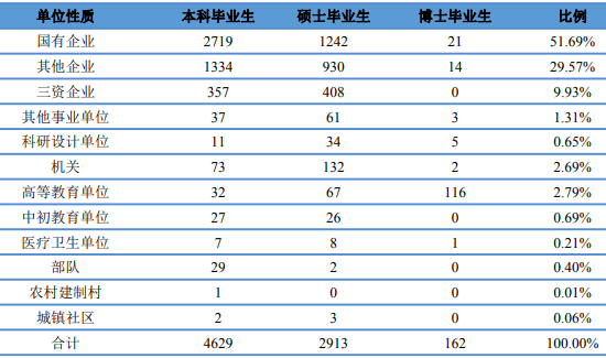 2022 年毕业生中,到企业就业 7025 人,其中到国有企业就业 3982 人,其他 企业就业 2278 人,三资企业就业 765 人;到高校、科研院所就业 265 人;机关和事业 单位等就业 383 人;部队就业 31 人。