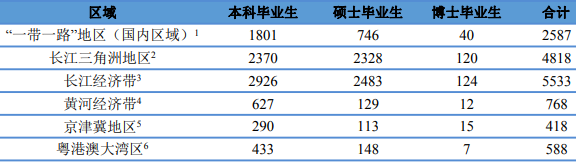 毕业生到“一带一 路”地区(国内区域)就业 2587 人,到长三角地区就业 4818 人,到长江经济带就业 5533 人,到黄河经济带就业 768 人,到京津冀地区就业 418 人,到粤港澳大湾区就业 588 人。