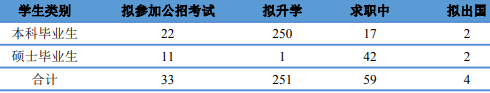 国内升学同学增加,主要是保研同学增加。其中留本校读研减少11人,去其他高校深造人数增加95人。