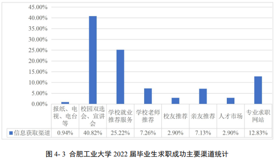 已经落实就业单位的学生中,通过学校渠道求职成功的学生占比 76.2%,其中校 园双选会、宣讲会占比 40.82%,学校的就业推荐服务占比 25.22%,学校老师推荐占比 7.26%,校友推荐占比 2.90%。