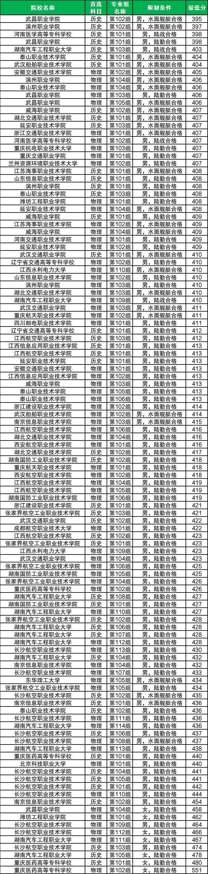 河南交通职业技术学院,376分(男),最低分专业组为101组,要求水面舰艇合格。