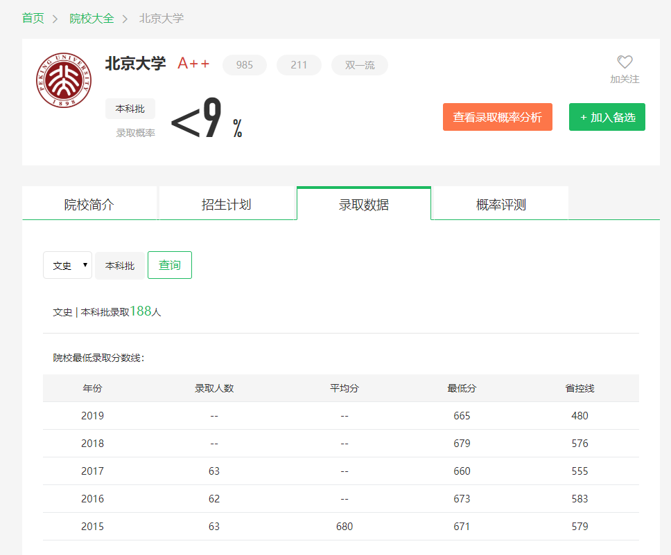 根据圆梦志愿及北京大学官网公布的招生录取数据可知: