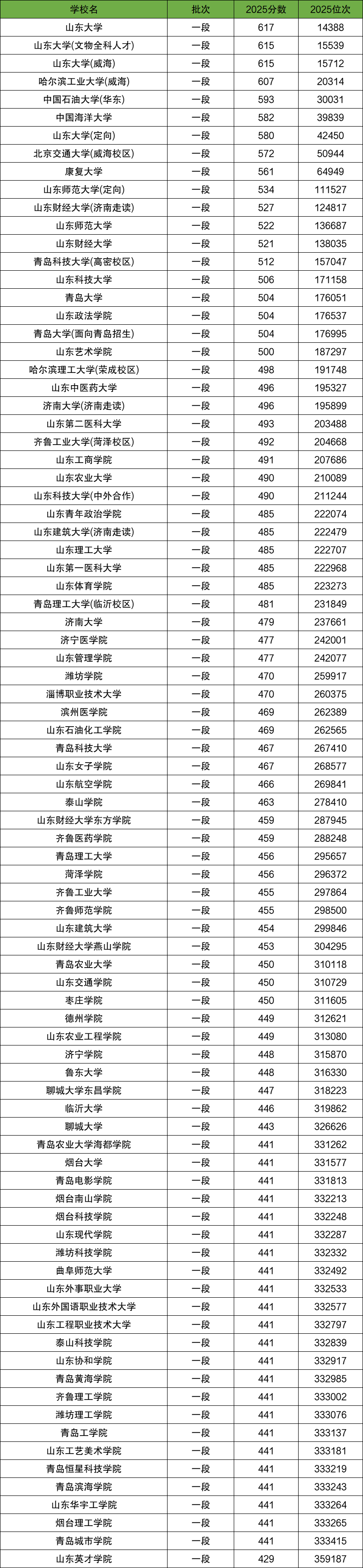 注:本文数据来源于山东省教育考试院发布的2025山东高考招录数据,仅分析了省内本科大学的录取分数线、位次以及排名情况。