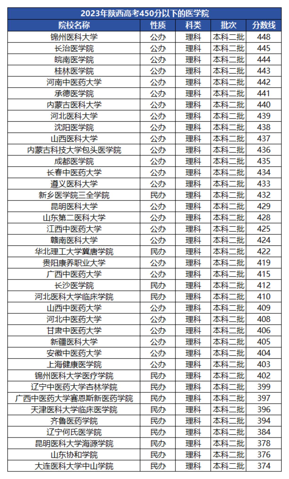 根据2023年全国各大医学院在陕西理科的招录情况,我们可以看到高考450分左右的理科考生不仅可以报考民办学校,还可以报考不少公办大学。