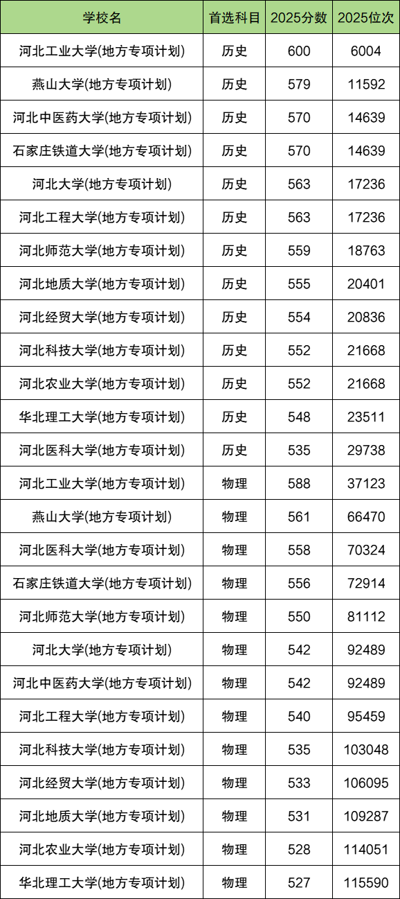 2025年河北省地方专项计划涵盖了省内主要公办本科院校,包括河北工业大学、燕山大学这样的省属重点高校。从数据上看,该计划为符合条件的考生提供了实实在在的分数优惠。