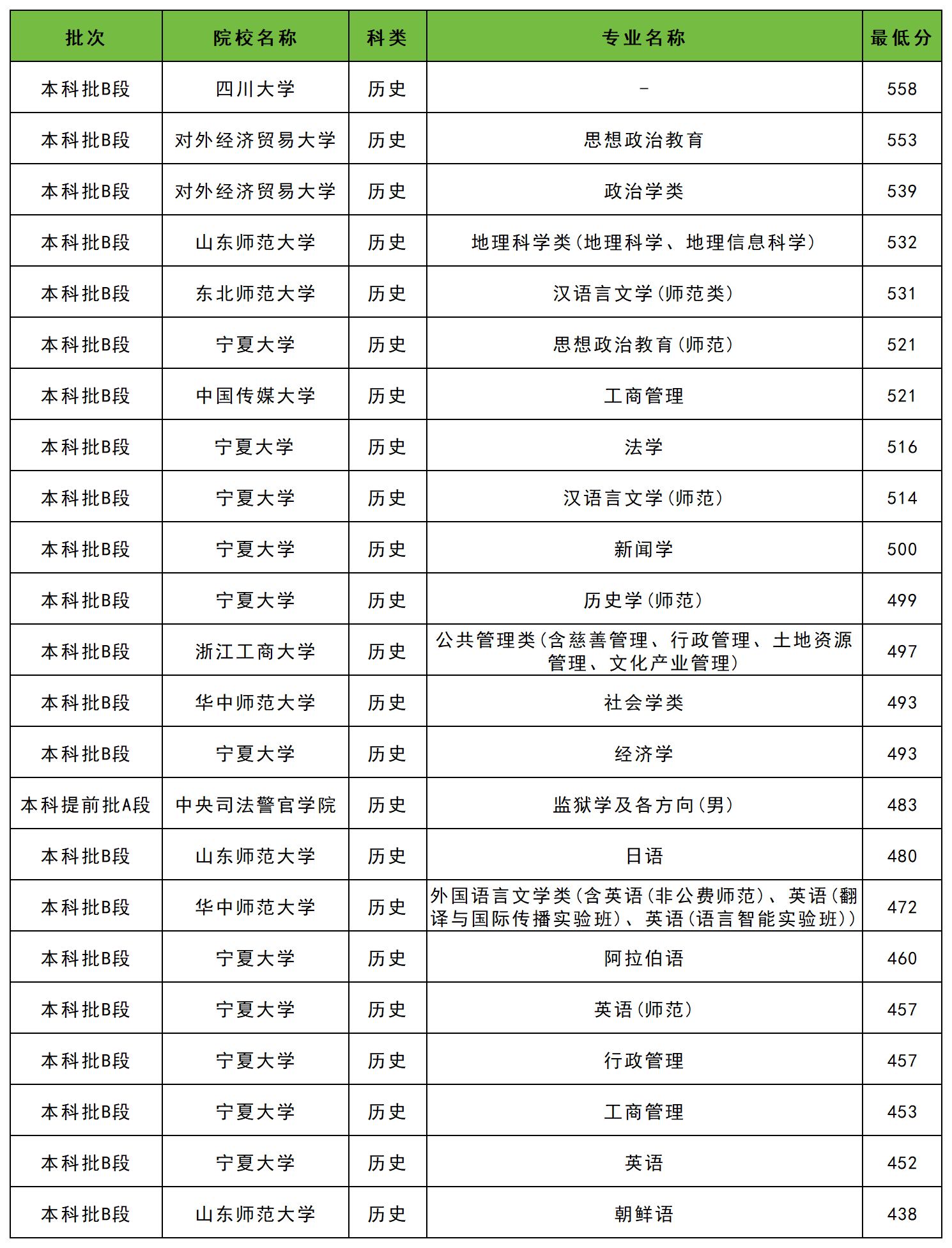 2025年宁夏国家专项历史类录取分数线位于438分到558分之间,各学校各专业最低分如下。
