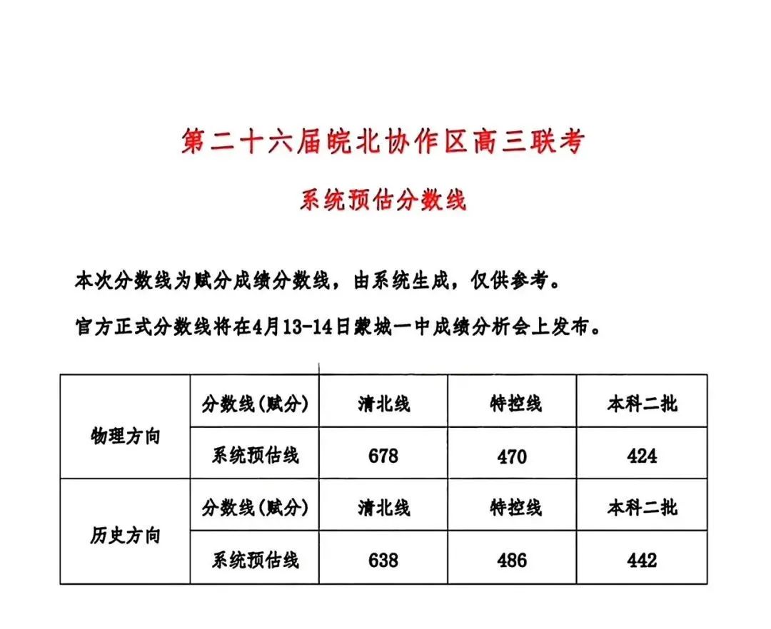 在4月14日进行的皖北协作区第二十六届联考分析会上,官方公布了预测分数线: