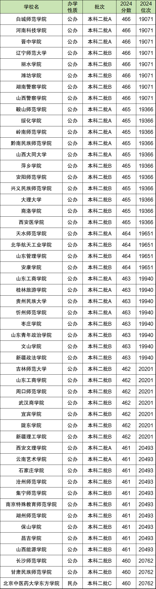 该范围内,最高位次19071名对应大学为白城师范学院、河南科技学院等,录取分数线为466分;最低位次20762名对应大学为长沙师范学院、甘肃民族师范学院等,录取分数线为460分。