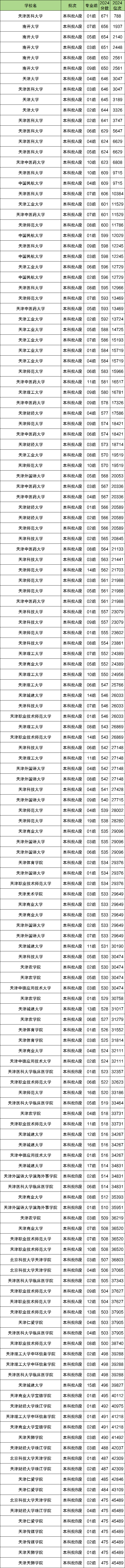 2024年天津的大学在天津市本科批录取中,收分最高的为天津医科大学01组,2024年最低分为671分,最低位次为788名;其次是南开大学07组,2024年最低分为656分,最低位次为1937名。