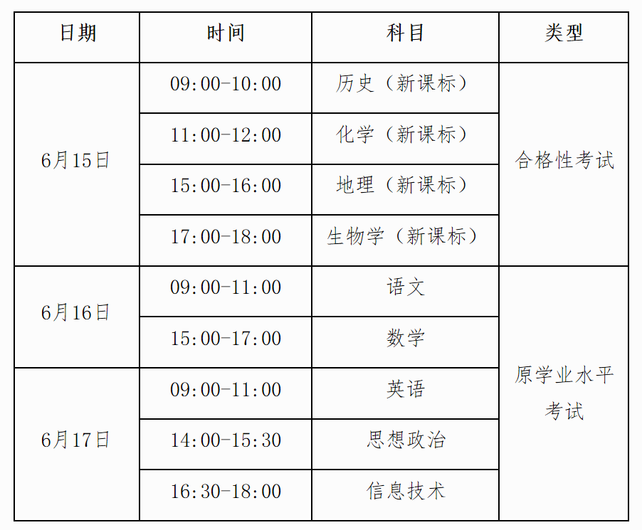 其中,15日举行普通高中学业水平合格性考试(以下简称合格性考试),开考历史、地理、化学、生物学等4门科目,报考对象主要为高中一年级学生;
