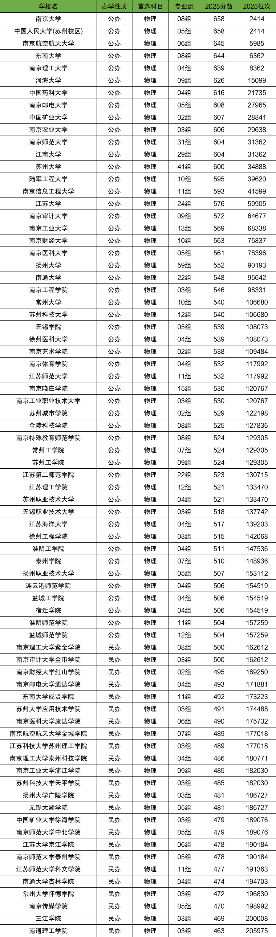 2025年江苏本科各大学在江苏物理类最低录取分数线位于463分-658分范围内,位次位于205975名-2414名之间。