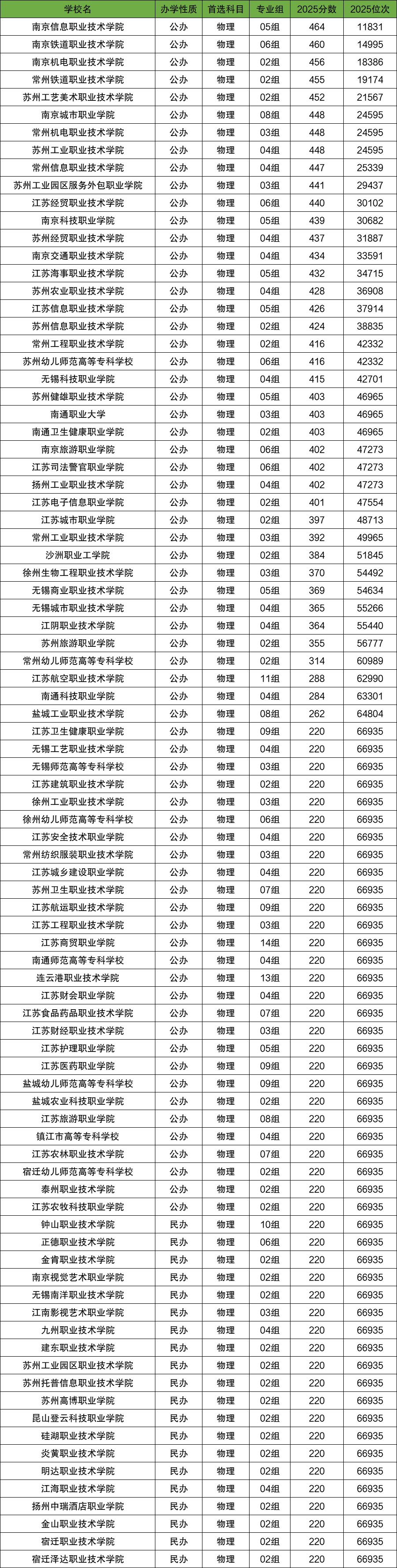2025年江苏专科各大学在江苏物理类最低录取分数线位于220分-464分范围内,位次位于66935名-11831名之间。