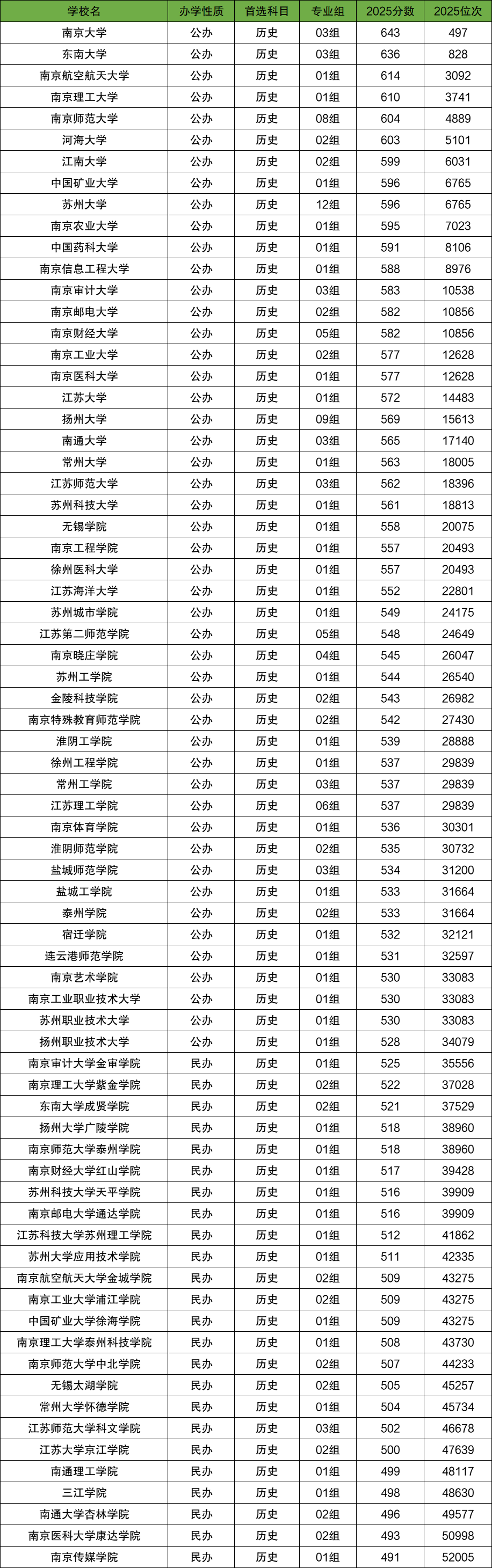 2025年江苏本科各大学在江苏历史类最低录取分数线位于491分-643分范围内,位次位于52005名-497名之间。