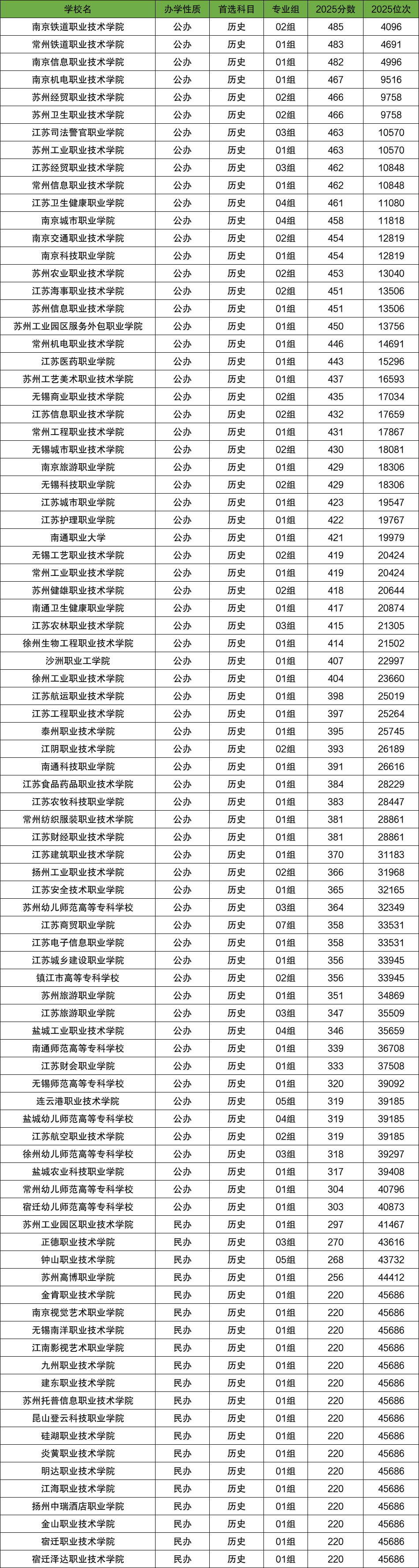 2025年江苏专科各大学在江苏历史类最低录取分数线位于220分-485分范围内,位次位于45686名-4096名之间。