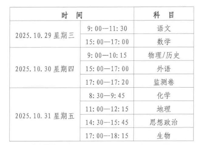 2026届绵阳一诊考试时间是2025年10月29日-31日,10月29日考语文和数学2门,10月30日考物理或化学、外语,10月31日考化学、地理、思想政治和生物。