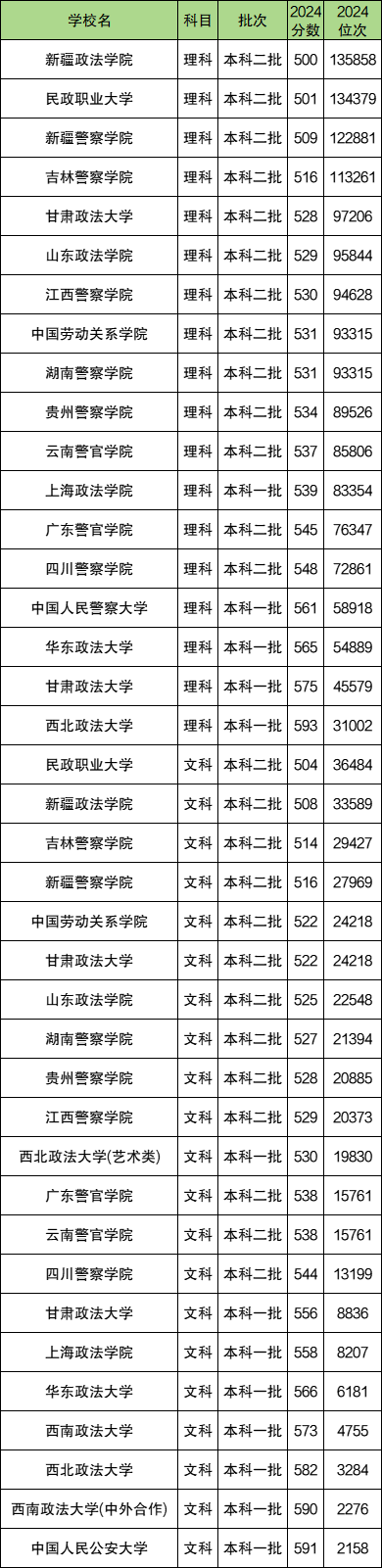 理科分数较低的政法大学有新疆政法学院、甘肃政法大学、山东政法学院、上海政法学院等。以上大学2024年最低分均低于594分,最低位次均高于31001名。