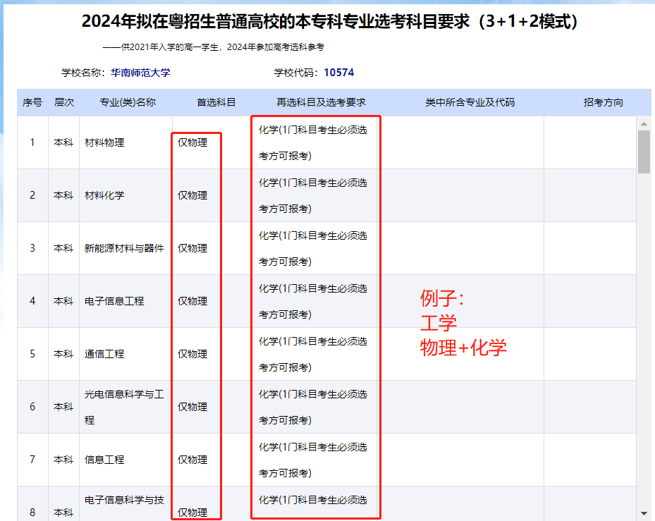 华南师范大学的材料科学、材料化学、新能源材料与器件、电子信息工程、通讯工程、光电信息科学与工程、信息工程、电子信息科学与技术等工学专业必须要求物理+化学的选科组合。