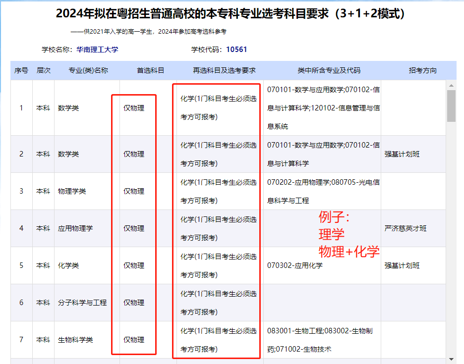 在2024年华南理工大学在广东招生的本科专业选考科目要求中可以看到:填报数学与应用数学、信息与计算科学、信息管理与信息系统、应用物理学、光电信息科学与工程、应用化学、生物工程、生物制药、生物技术等专业物理和化学必须一起选。
