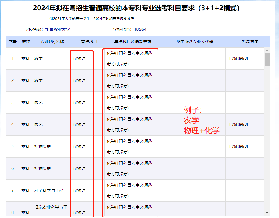 华南农业大学的农学、园艺、植物保护、种子科学与工程、设施农业科学与工程等农学专业必须要求物理+化学的选科组合。