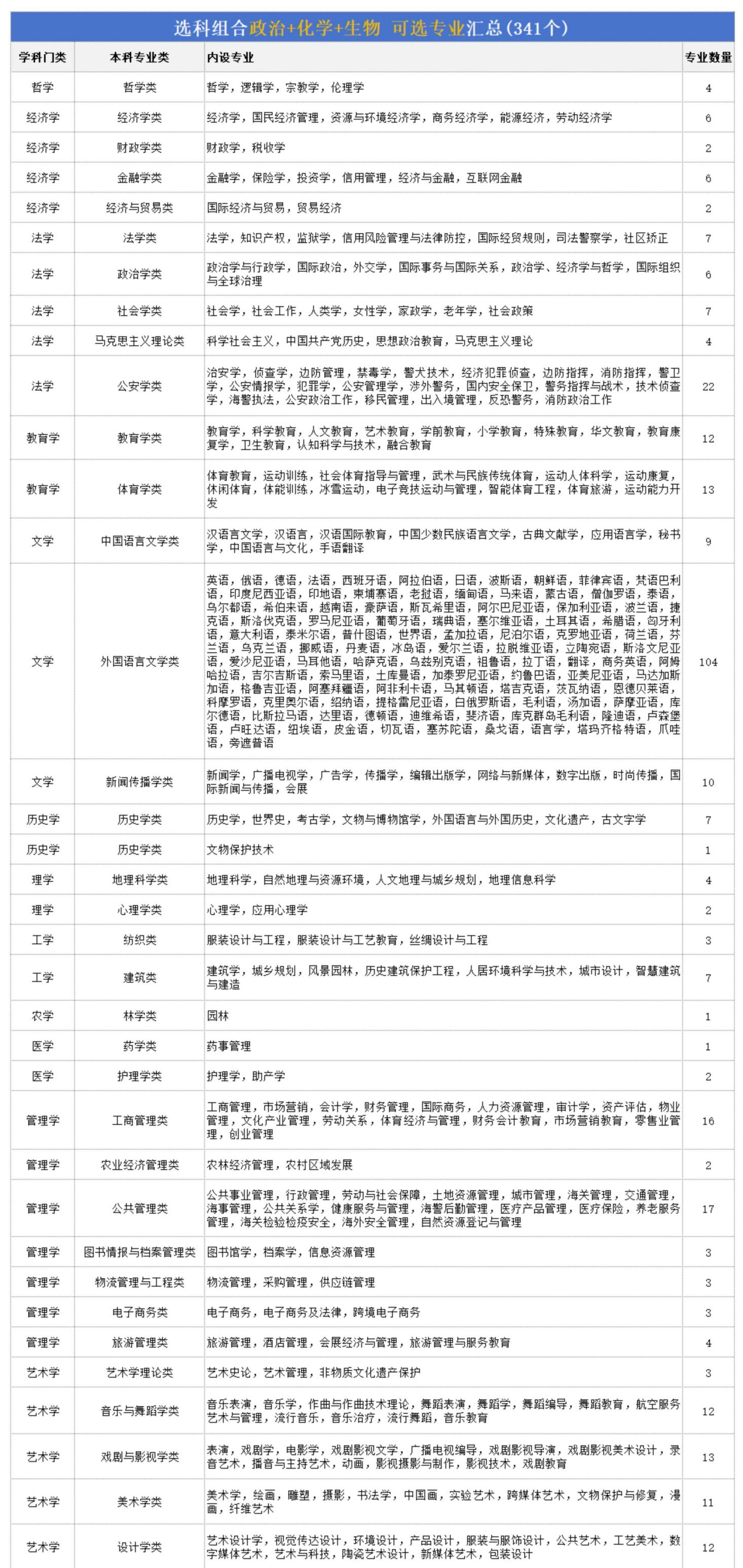 化生政可选专业包括外国语言文学类、体育学类、新闻传播学类、农业经济管理类、艺术学理论类等,具体专业可参考下表: