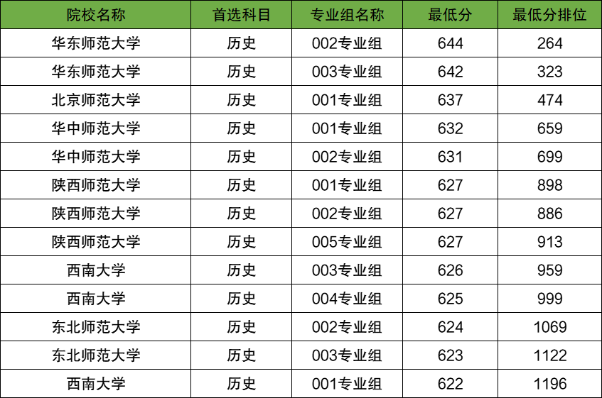 2025年历史类录取分数线范围是622分到644分,收分最低的学校是西南大学001专业组,对应位次1196名。