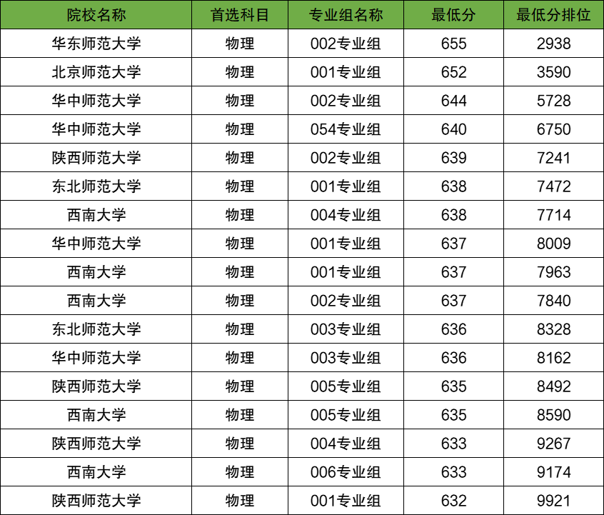 2025年物理类录取分数线范围是632分到655分,收分最低的学校是陕西师范大学001专业组,对应位次9921名。