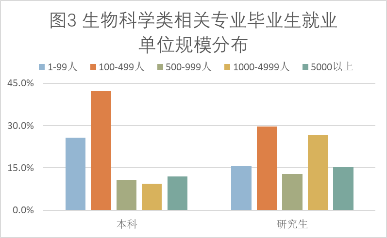 在用人单位流动中,图3所示,生物科学类专业人才就业流动以中型企业为主,这意味着初具规模的发展型企业对生物学人才来说存在更多就业机会。从学历分布来看,中小型单位吸纳的本科毕业生较多,而研究生(含硕士、博士)主要集中在中、大型企业。