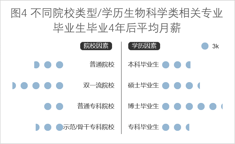 综上,生物科学类相关专业毕业生薪资不仅和学历院校背景相关,也受到工作经验、从业行业和就业地生物产业发展的影响。生物产业水平高的城市经济发展迅速,相应的新需求不断增加,这为专业的发展提供了动力和可能性。生物产业水平相对不高的城市在这个方面的发展则相对缓慢一些。因此,生物科学类毕业生如何提升自己的核心竞争力十分重要。“专业能力是提升个人核心竞争力的重要环节,比学历更加实用,应该根据自己的职业发展方向借助职场导师的职业指导有针对性地提高职业能力。从事生产管理,就要在专业技能过硬的基础上,加强管理方面的能力,这样才能有效的拓展自己的职业发展空间。”某名企人力资源总监表示。