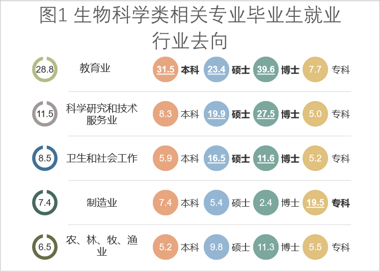 从行业去向来看,图1所示,生物科学类专业毕业生选择了教育行业、科学研究和技术服务业。其中,本科生集中在教育行业,研究生(含硕士生、博士生)就业行业兼顾教育业、科学研究和技术服务业以及卫生和社会工作,专科生就业行业则侧重于制造业。