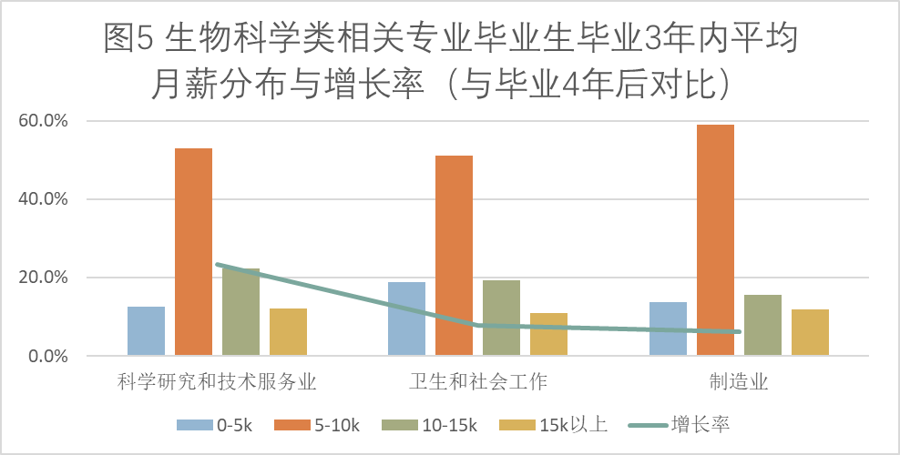 从行业薪资来看,生物科学类毕业生的薪资也因从事的行业不同而呈现差异。以备受关注的科学研究和技术服务业、卫生和社会工作业、制造业为例,图5所示,三大行业的平均月薪中位数皆处于5-10k区间,但存在些许差别,其中科研行业在毕业4年后的平均月收入相较于其他行业涨幅最高,超过20%。