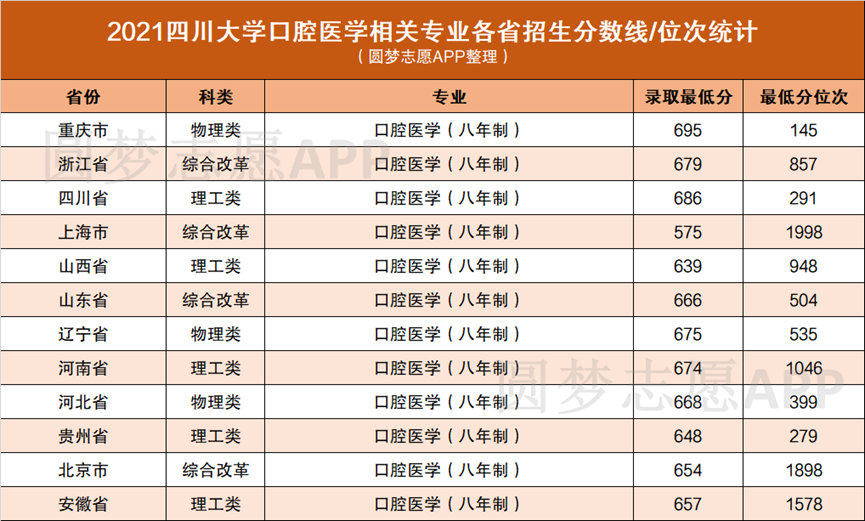 我们收集整理了2021年川大口腔医学八年制在各省招生最低分及位次情况供大家参考: