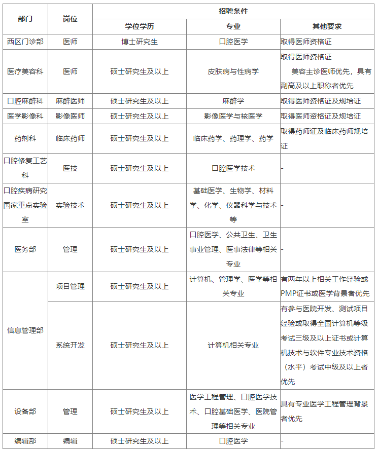 图为2021华西口腔医院招聘启事(第二批)招聘岗位及条件