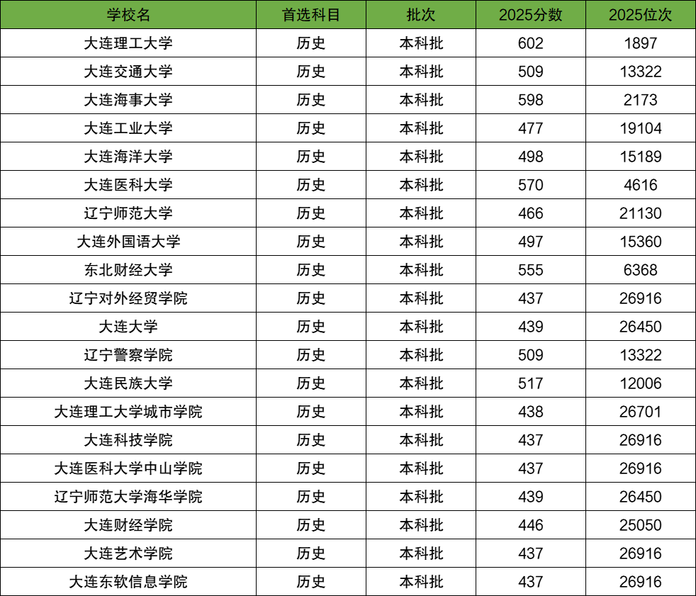 2025年大连本科各大学中,在历史类分数线最高、最难考的院校是大连理工大学,2025年录取分数602分,录取位次1897位;