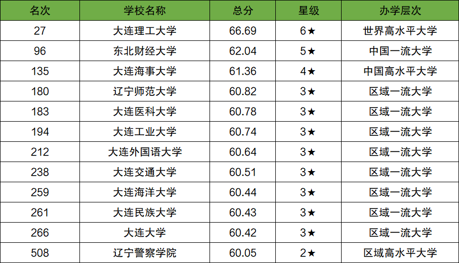 大连各大学排名为:第1名大连理工大学、第2名东北财经大学、第3名大连海事大学等;而大连各大学最低录取分数线则是大连理工大学历史类602分、物理类618分,东北财经大学历史类555分、物理类554分等。