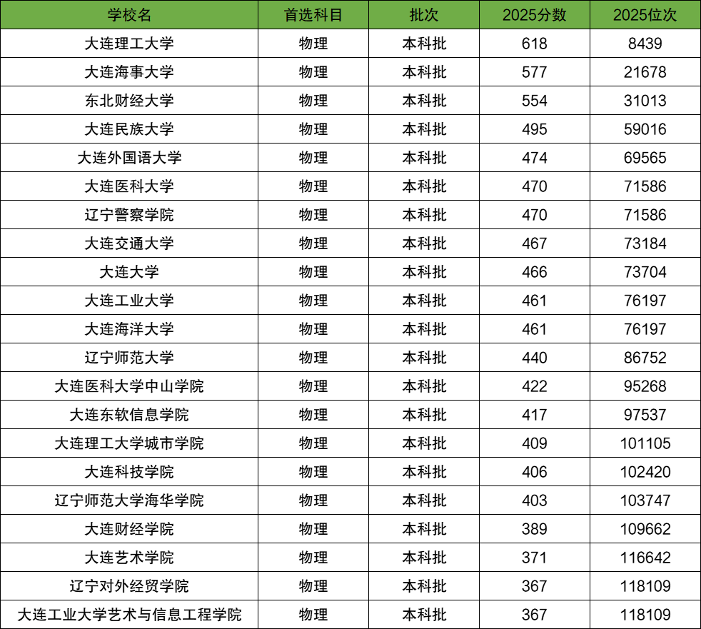 2025年大连本科各大学中,在物理类分数线最高、最难考的院校是大连理工大学,2025年录取分数618分,录取位次8439位;
